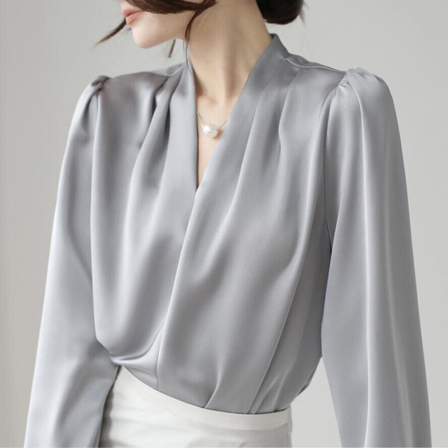 シャツ ブラウス Vネック トップス レディース サテン風 シンプル 気質