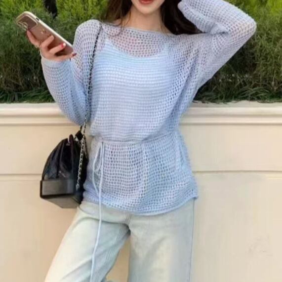 透かし編み メッシュ ニット 長袖 カギ編み 透け感 抜け感 サマーニット