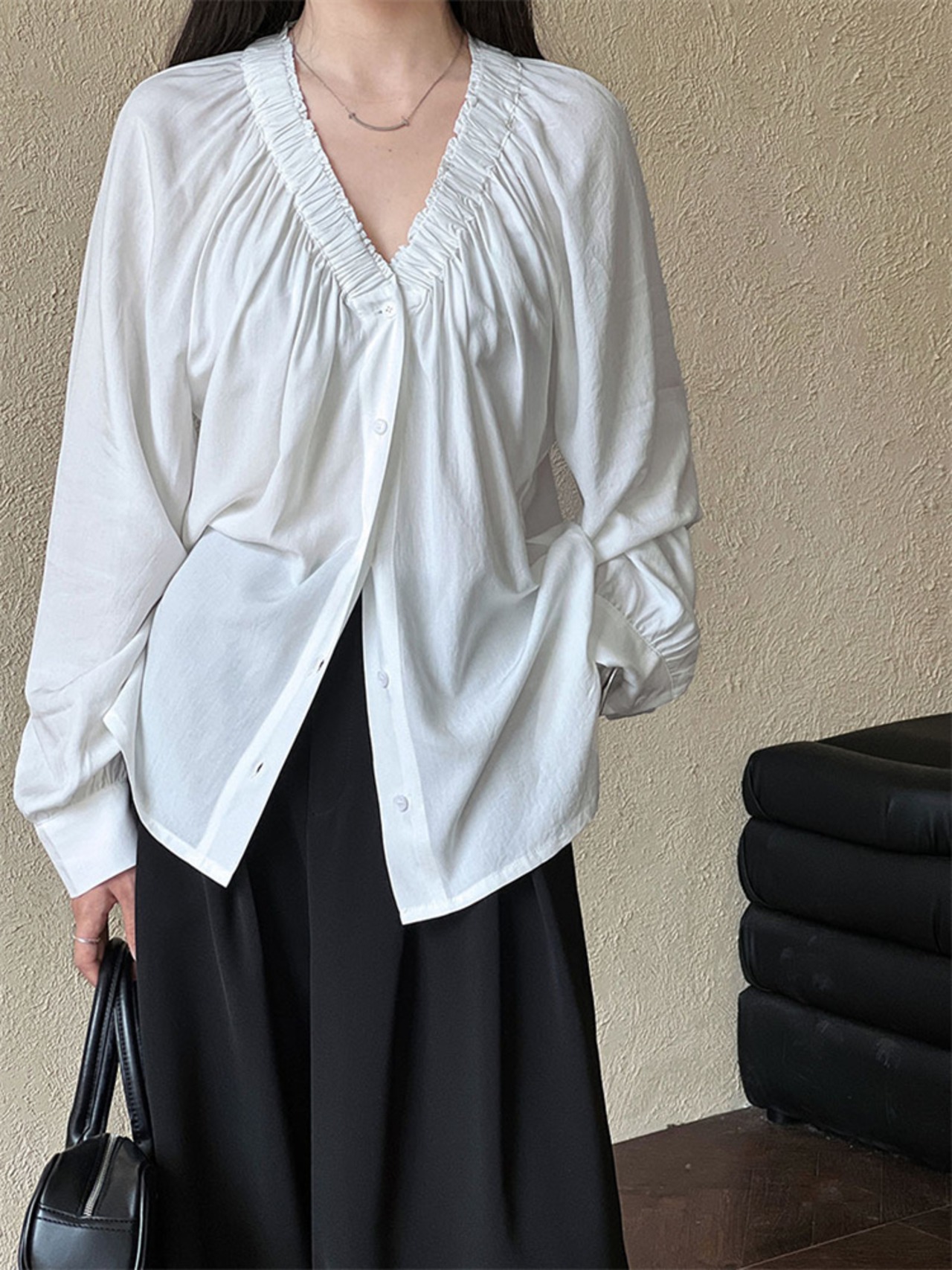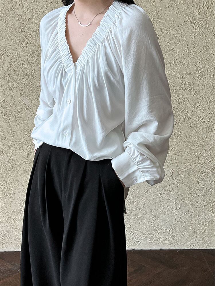 着痩せ効果 激安セール 春の通勤スタイル ゆったりVネック プリーツデザインシャツ 大人女性向け