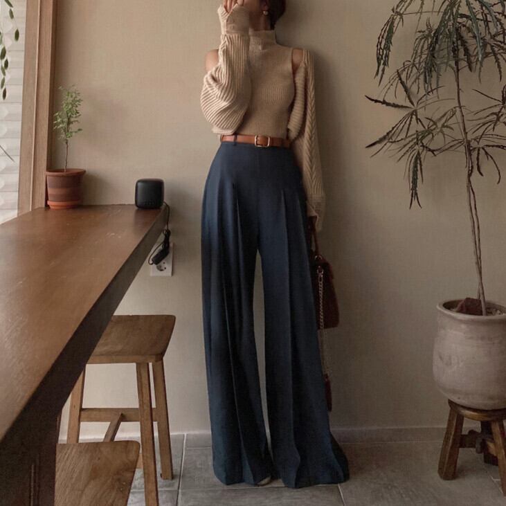 ロングパンツ マキシ丈 パンツ レディース プリーツ ハイウエスト ワイドパンツ 気質 シンプル