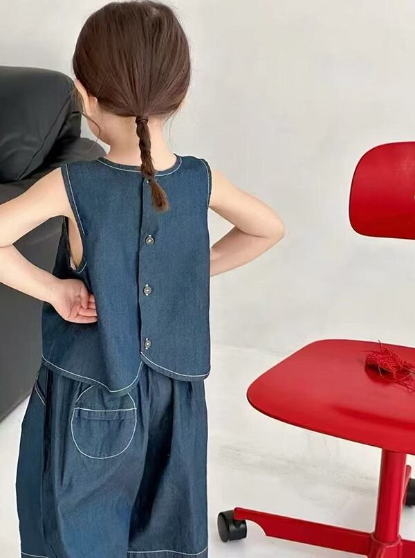 韓国子供服 キッズ デニム セットアップ ノースリブ ワイドパンツ