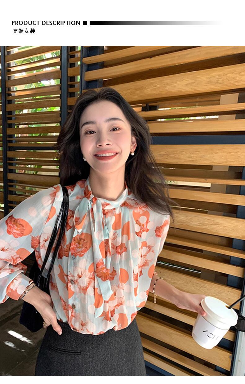 高質フレンチスタンドネックプリントブラウス OL レディース
