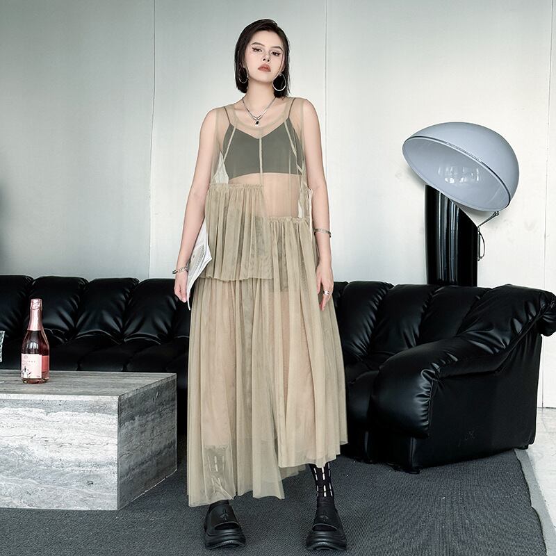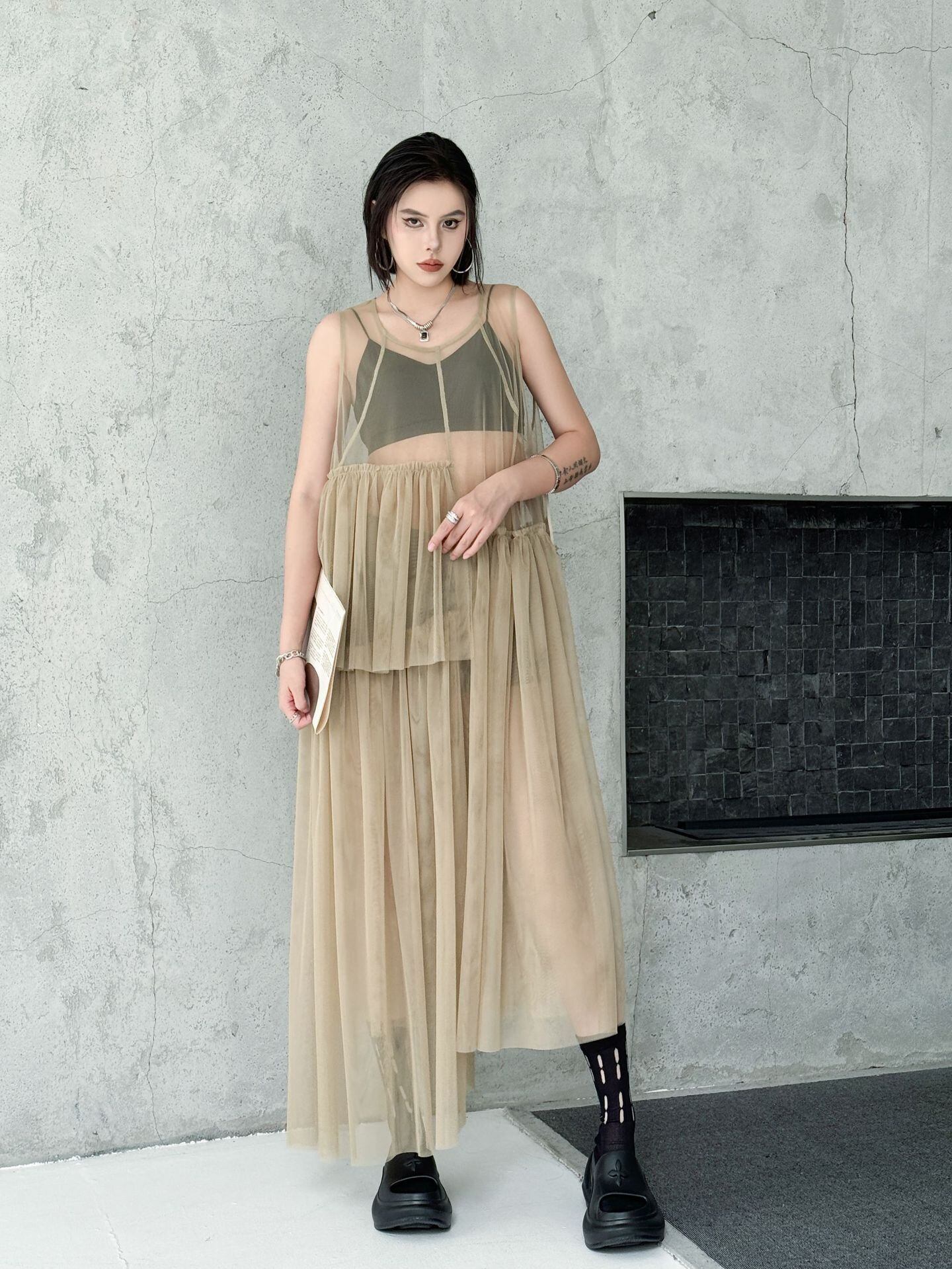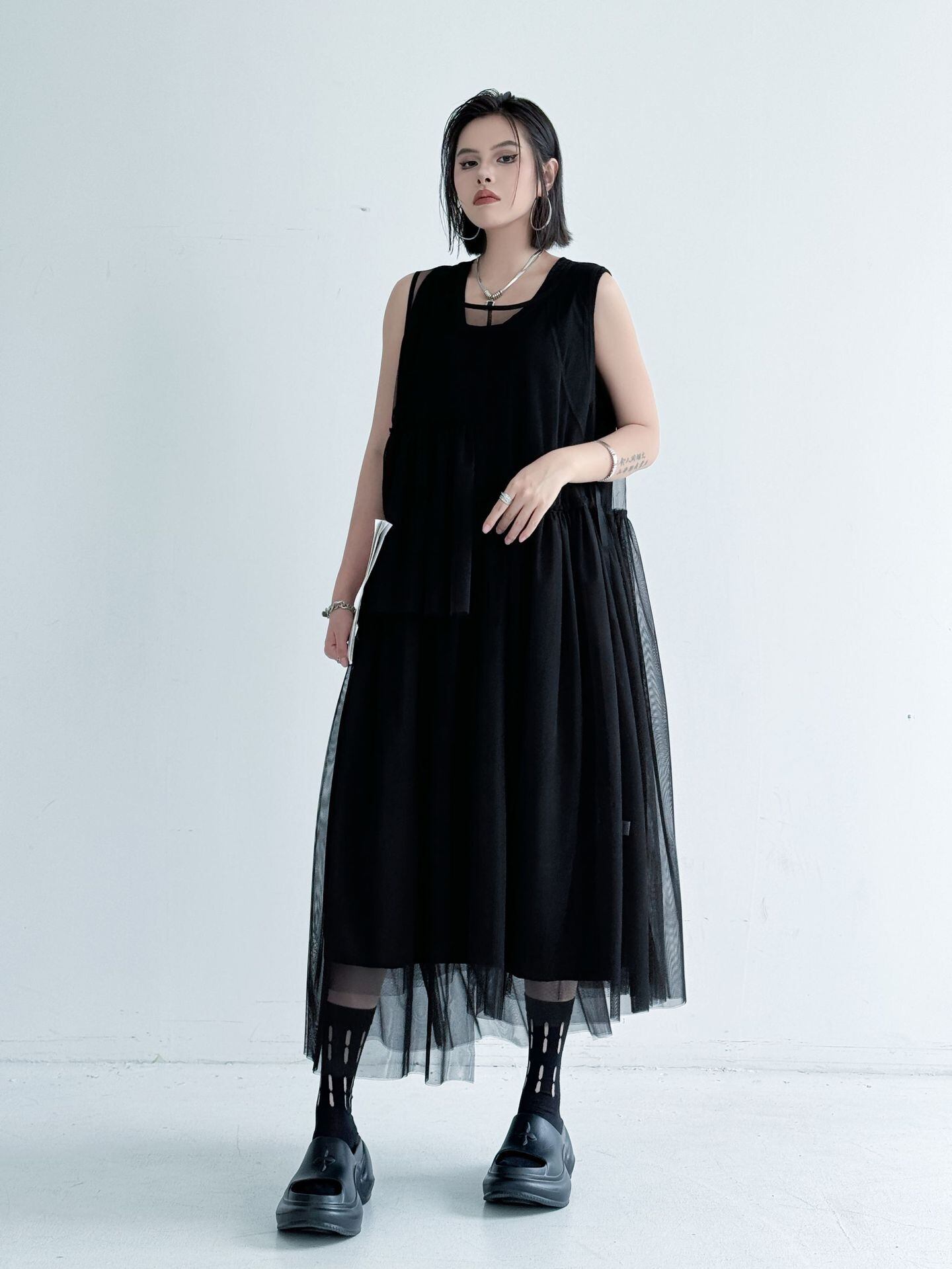 トップス レディース ロングワンピース チュール ノースリーブ 2色 カジュアル