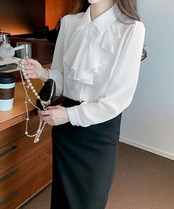 エレガントな雰囲気を漂わせるフリルリボンタイブラウス