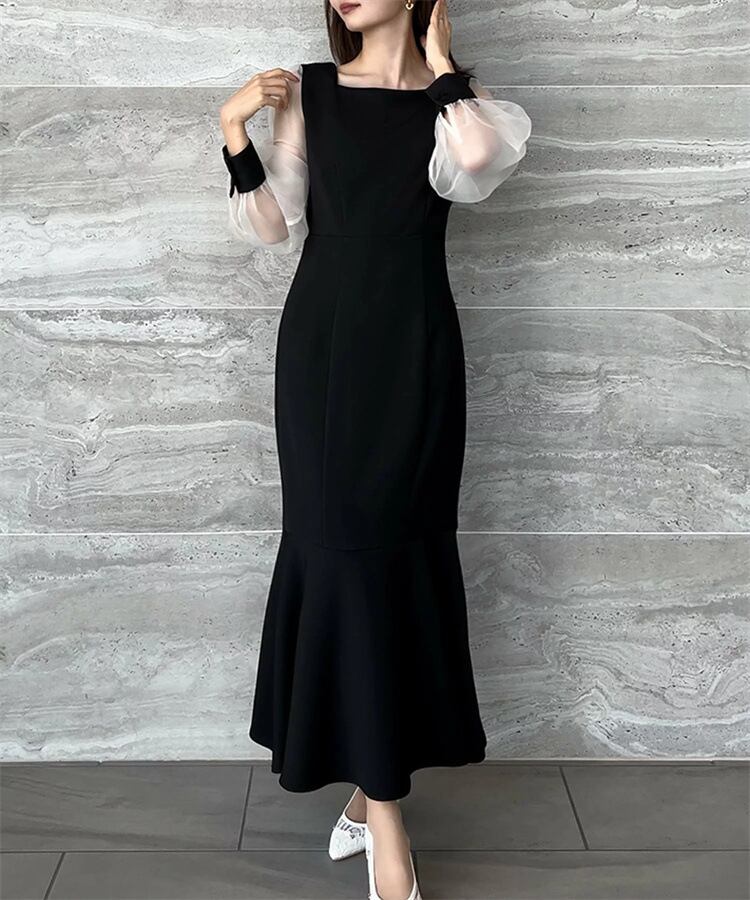ワンピース レディース ロング丈ワンピース 長袖 ドレス 異素材 気質 きれいめ