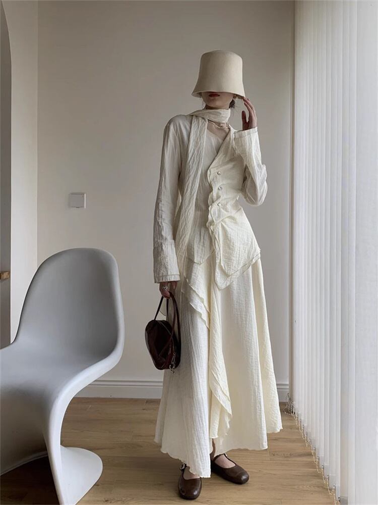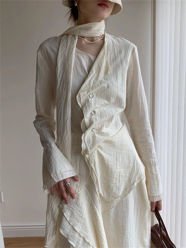 Vカット アシンメトリーデザイン フレアスリーブ ロングブラウス