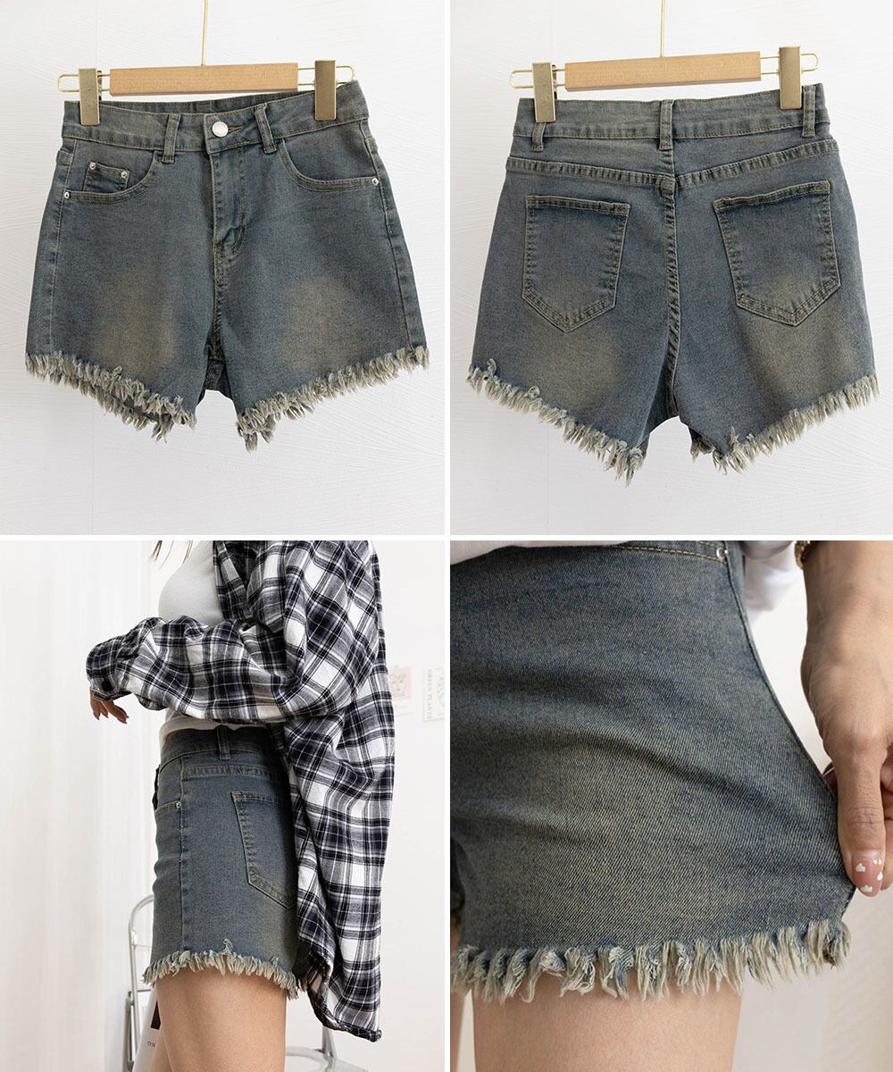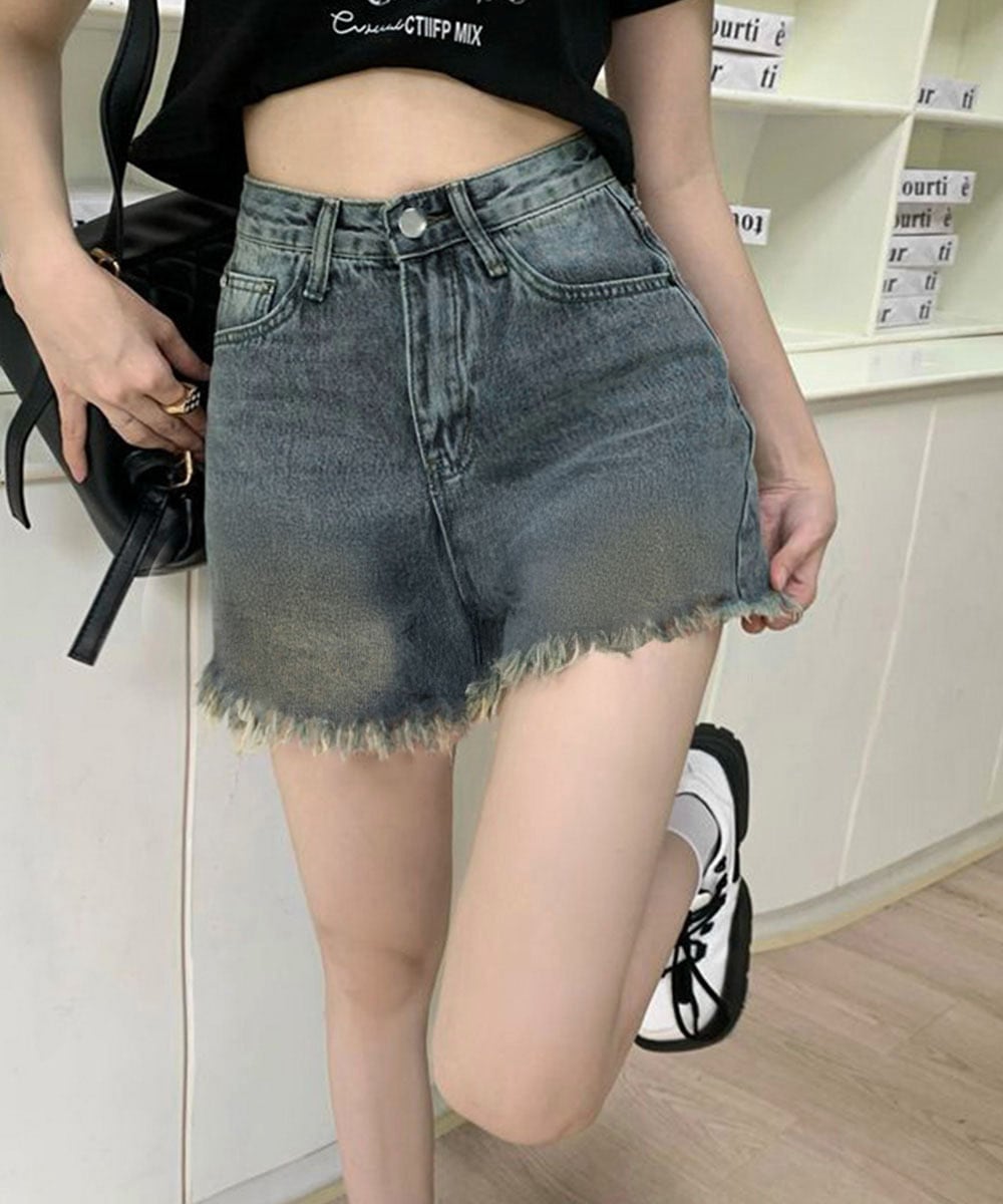 裾フリンジデニムショーパン 美脚脚長ジーパン おしゃれ アメカジホットパンツ細見え美尻ジーンズ レトロ短パン オルチャン