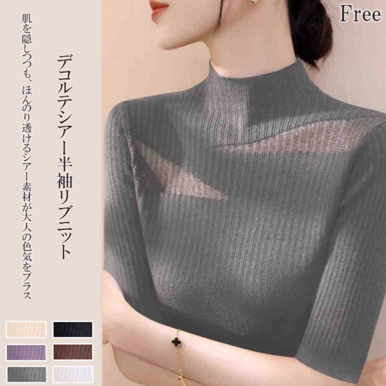 レディース デコルテシアー リブニット ハイネック 半袖 キレイめ 夏 薄手 トップス