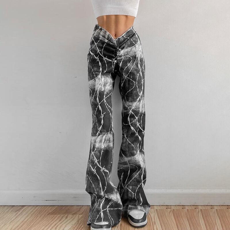 パンツ ボトムス ハイウェスト フレアパンツ プリント ワークパンツ レディース